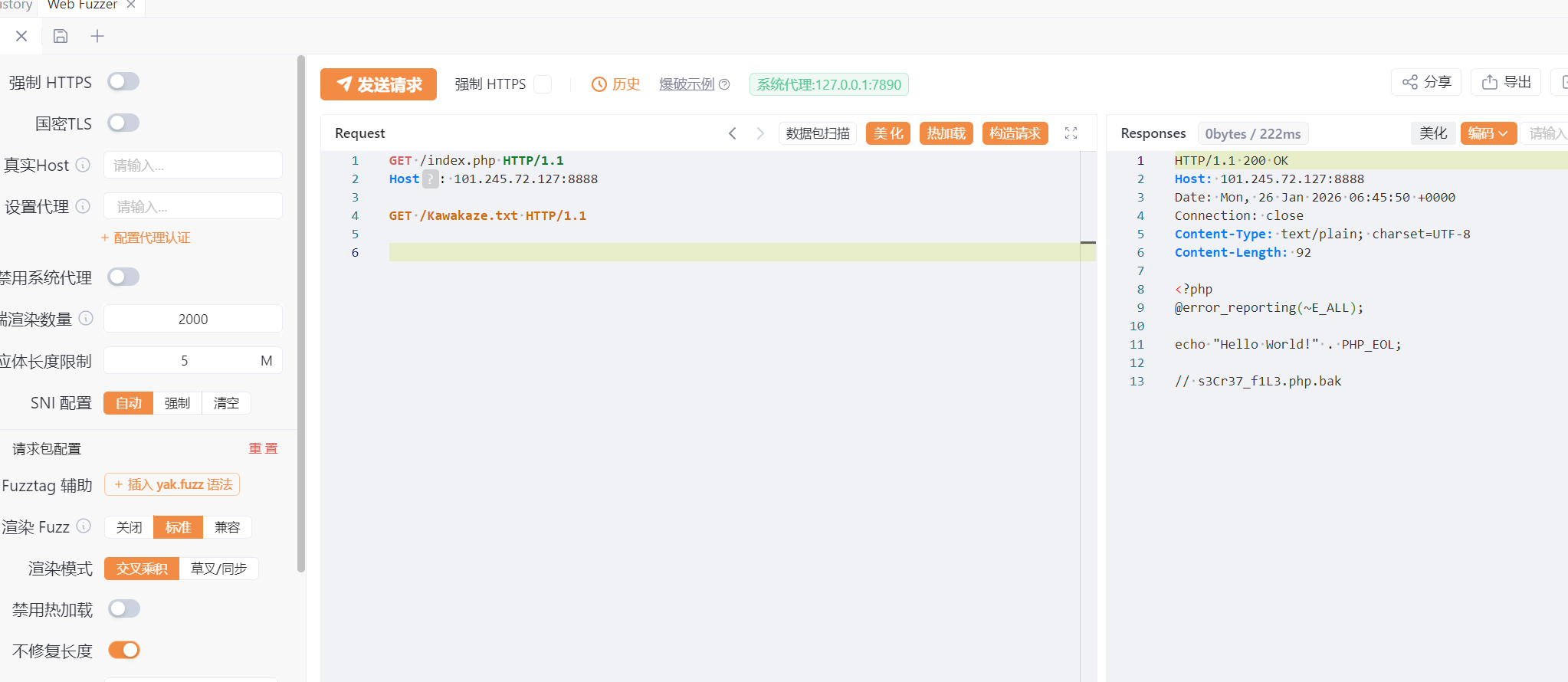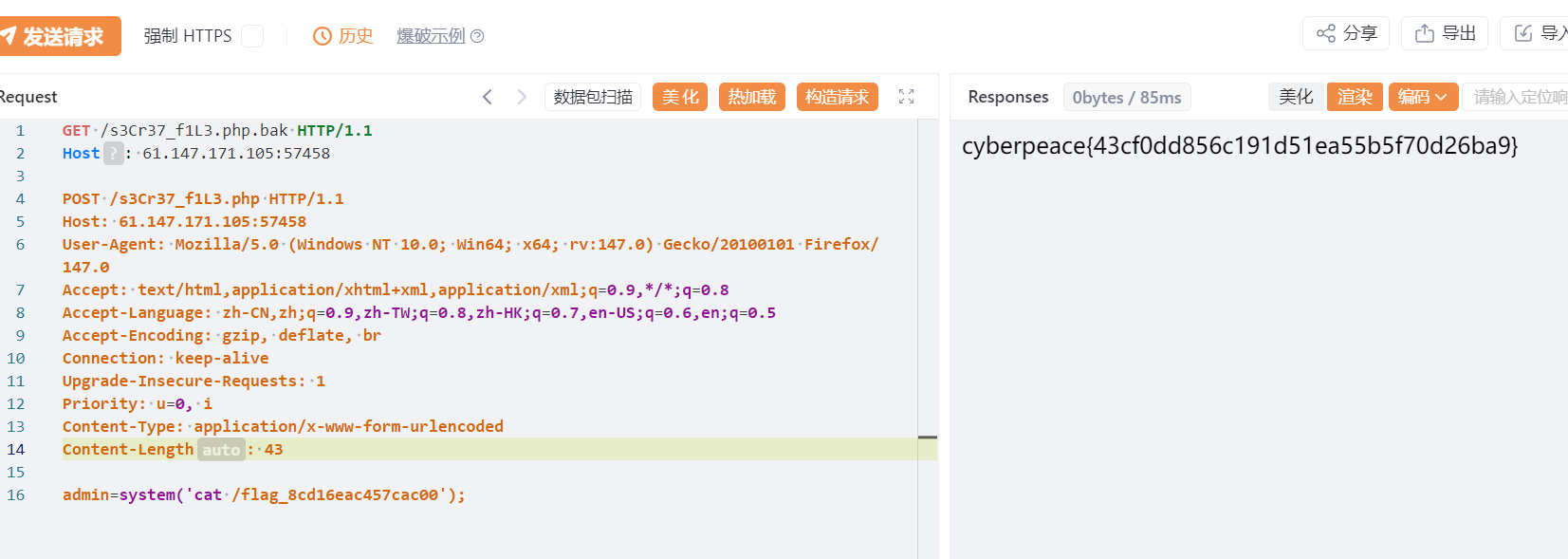 如果是txt文件的话,他返回的格式就是Text/plain,于是就以第二请求为.php文件去访问s3Cr37_f1L3.php.bak