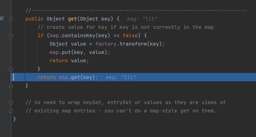 接着我们会key.hashCode()即TiedMapEntry.hashcode(),这样就接上上面的了,接着会调map.get即LazyMap.get,完成。