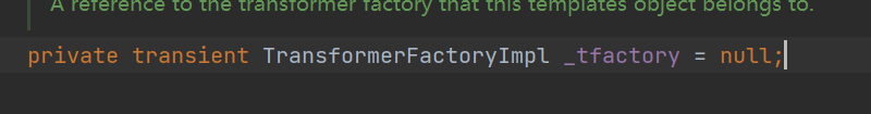 但是因为需要赋_tfactory,我们去看,发现private transient这是不可以序列化的,所以我们给它赋值没意义,反序列化的时候它不会被传进去(transient 是 Java 专门用来标记「不参与默认序列化」的变量修饰符)