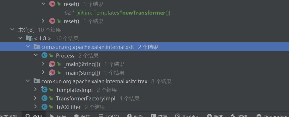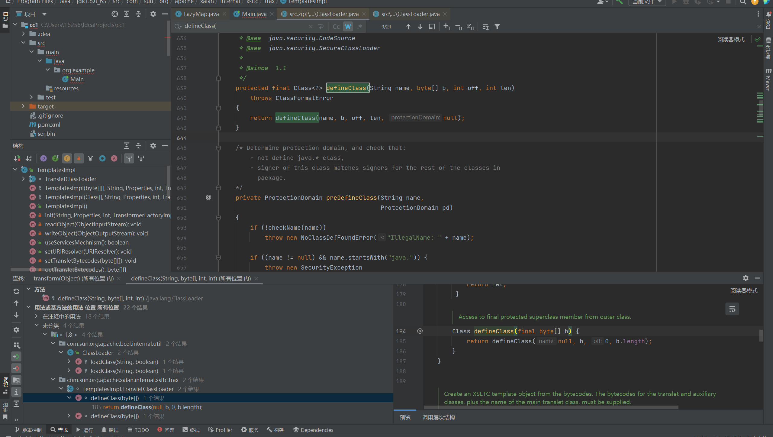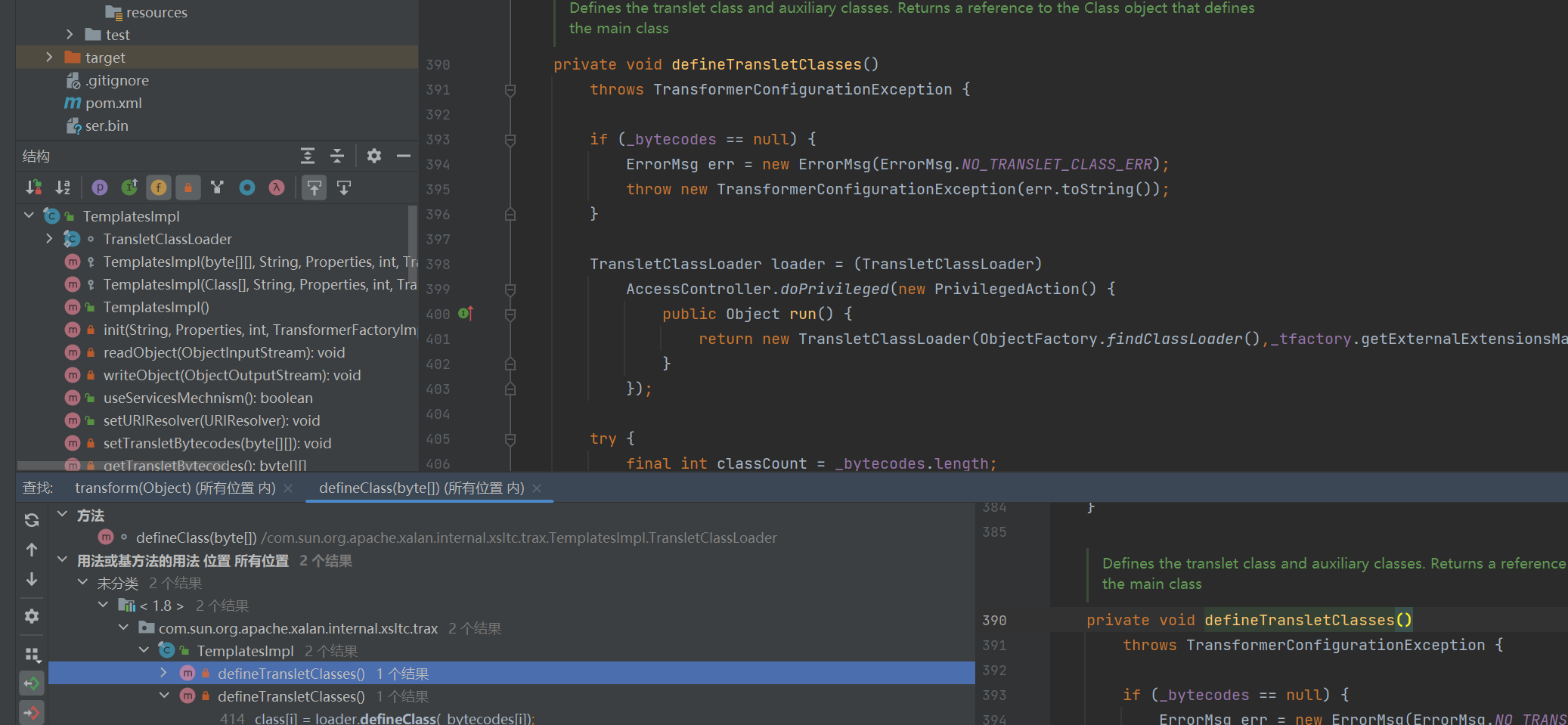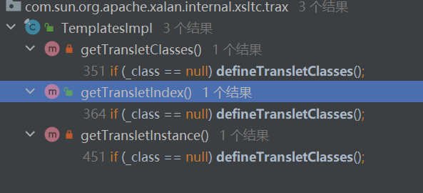 就这么查找,找到了这种格式的defineClass的public的方式(没有写作用域,包里可调用的default),在TemplatesImpl里,我们再在这个包里查找这个defineClass被什么调用