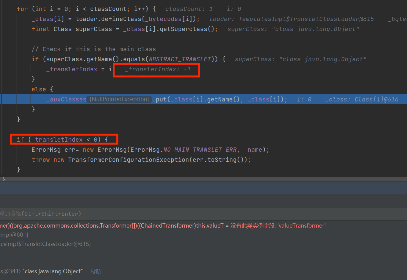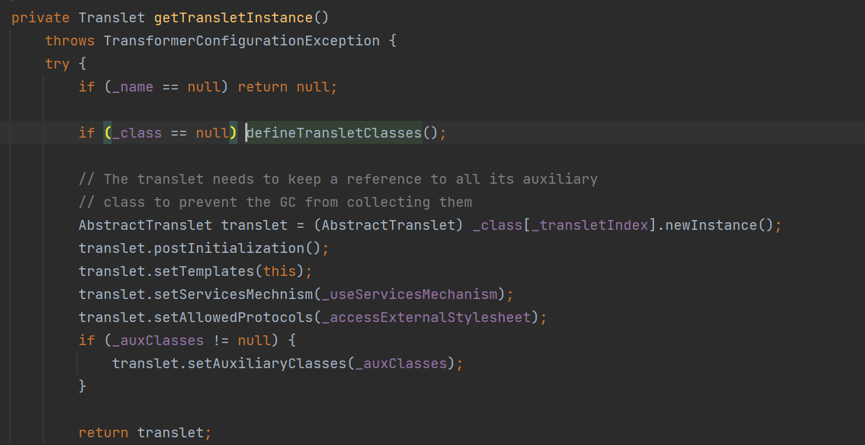 可以看到第一个是直接返回_class,需要后续操作初始化,第二个是返回下标,第三个是.newInstance()初始化后就可以动态执行代码,于是我们就选这个getTransletInstance()继续找。